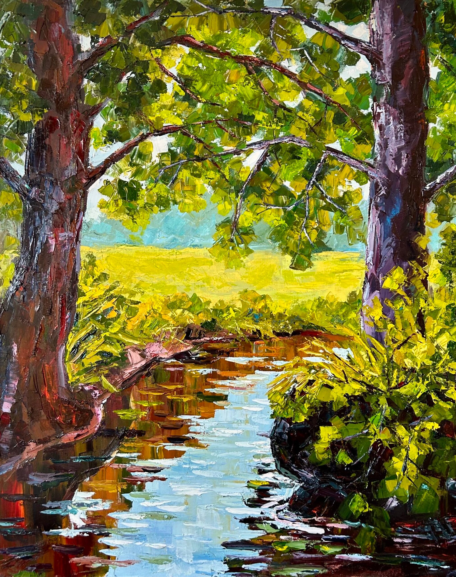 Bosque con grama junto a riachuelo.
